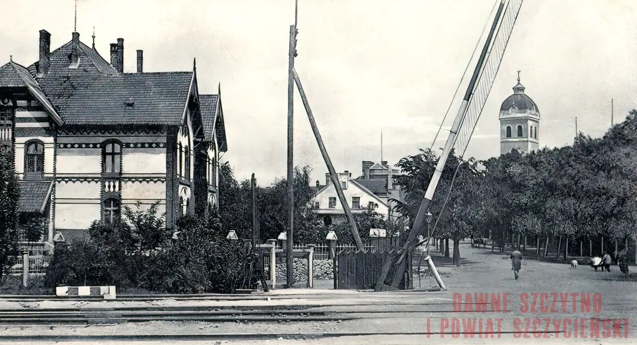 Ulica Warszawska - obecnie - ówcześnie Kirchenstrasse - przejazd kolejowy. W miejscu widocznego z lewej budynku stoi obecnie LCS Szczytno. Widok w kierunku północno-wschodnim: w prawo perony, w lewo Olsztyn, Wielbark/Ostrołęka. Zdjęcie ze strony FB Dawne Szczytno i Powiat Szczycieński.