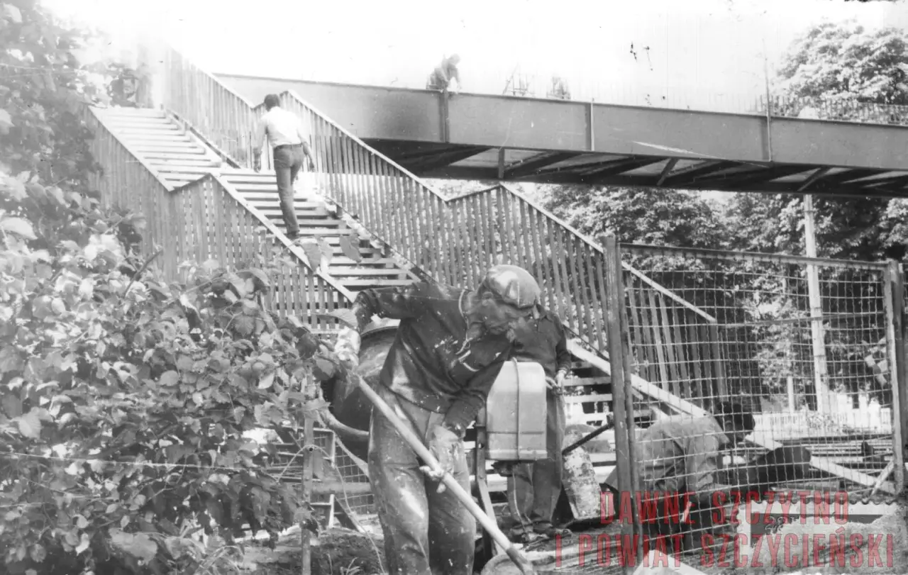Prace budowlane przy kładce przy stacji Szczytno, na wysokości ul. Chrobrego. Rok 1979. Kładkę rozebrano w roku 2011.