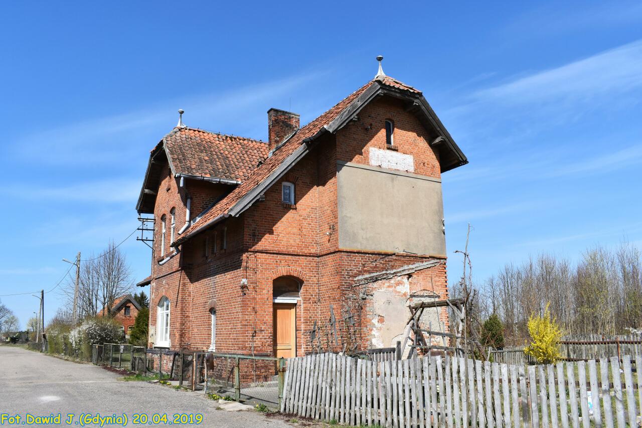 Widok z dawnego peronu w kierunku Biskupca Reszelskiego. Budynek dworcowy i budynek WC znajdują się po lewej stronie. Na ścianie szczytowej dworca widać pozostałość po rozebranym magazynie towarowym.