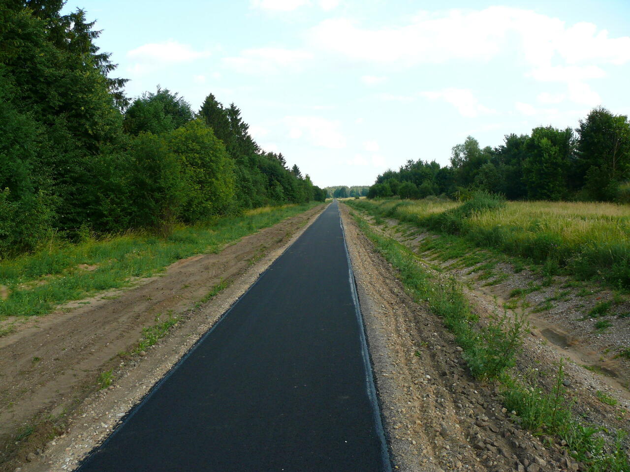 Widok na dawny peron, z miejsca w którym kiedyś znajdowały się tory, a jest obecnie ścieżka rowerowa oraz w kierunku Biskupca Reszelskiego. Budynek dworcowy znajduje się po lewej stronie.