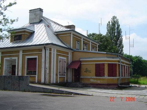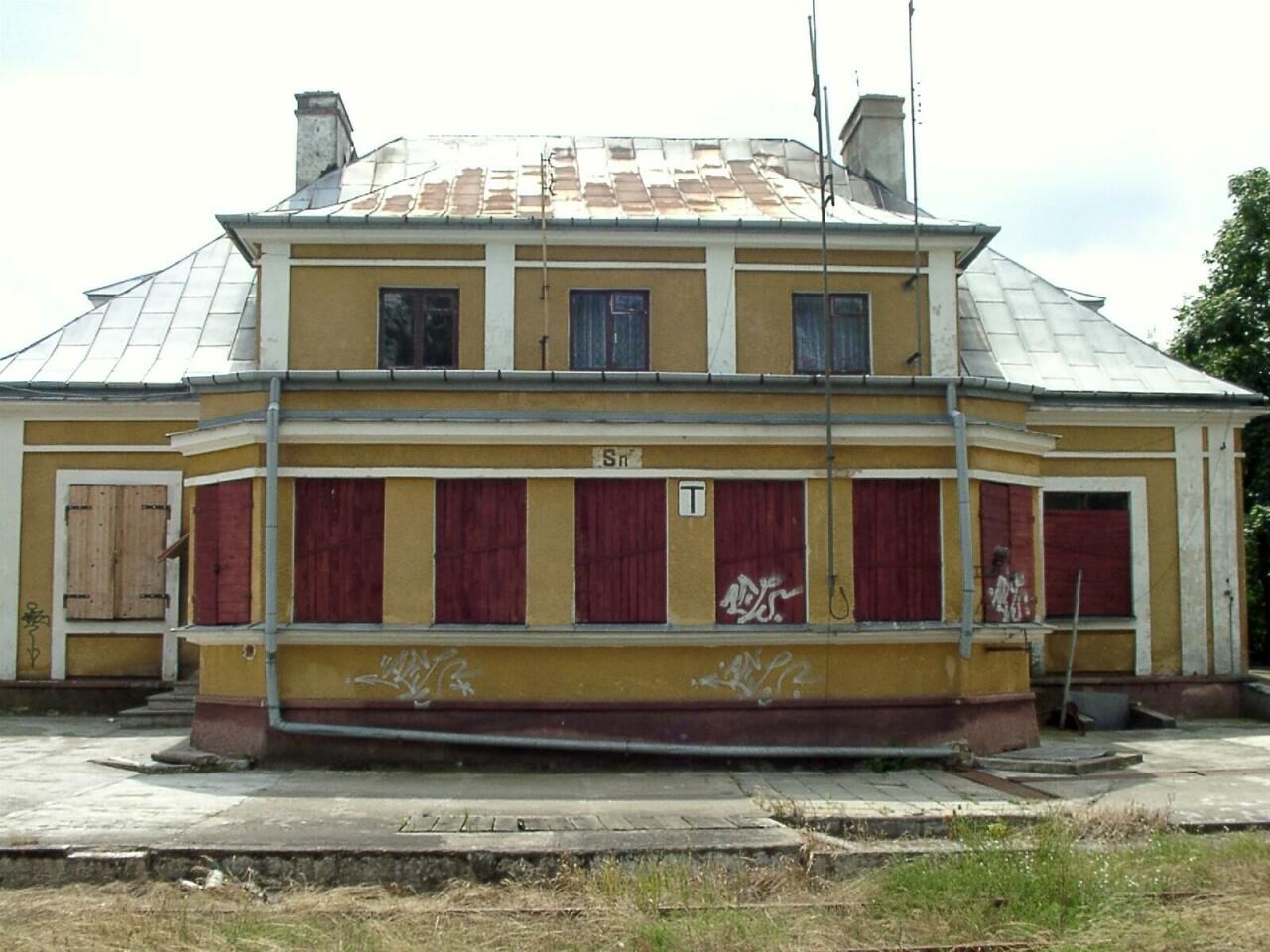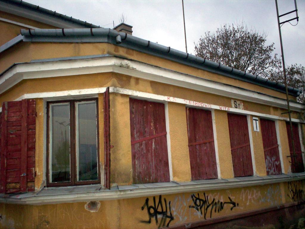 Budynek dworcowy a w nim czynna nastawnia dysponująca "Sn".
