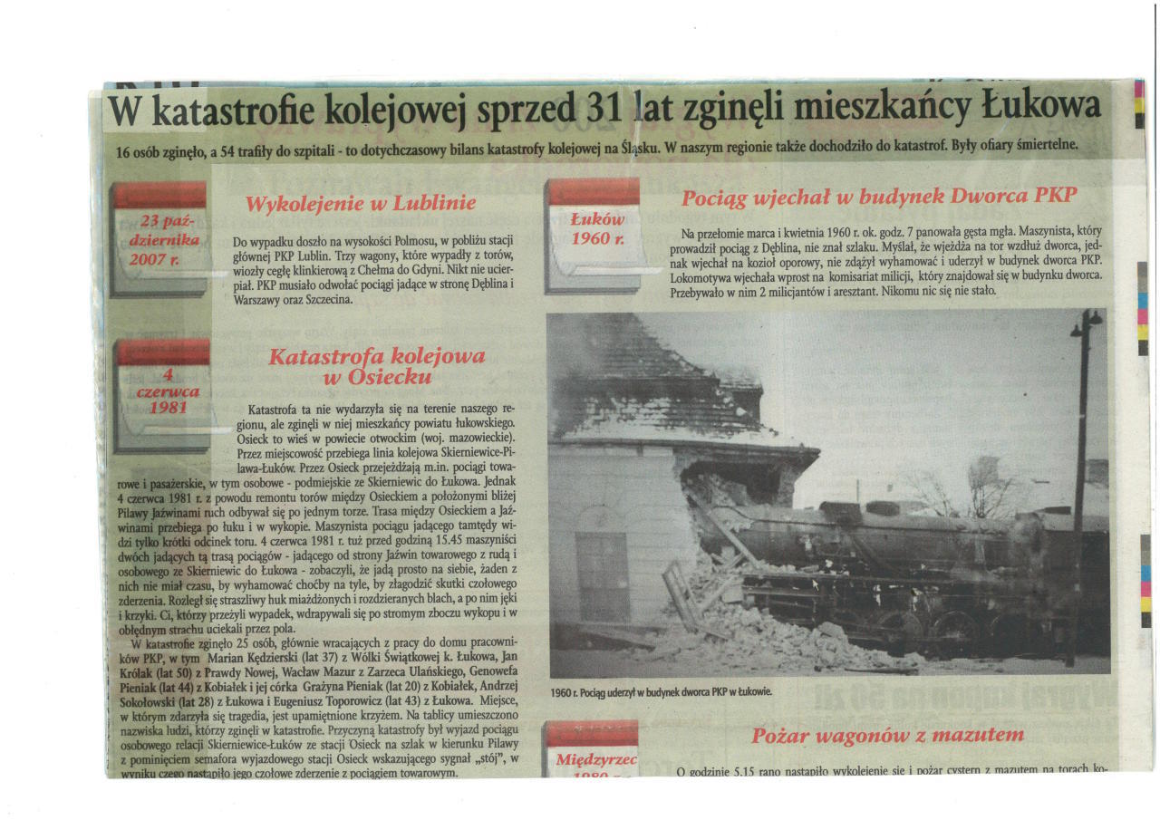 Artykuł ze "Wspólnoty Międzyrzeckiej" z marca 2012 roku, który pojawił się po katastrofie kolejowej w Szczekocinach. Na zdjęciu parowóz, który wjechał w budynek dworca PKP w Łukowie w 1960 roku.
