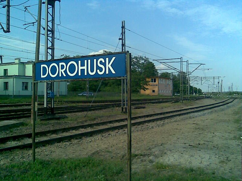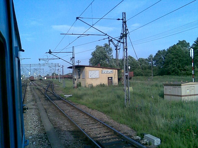 Zachodnia głowica rozjazdowa; wyjazd na Chełm. Po lewej nieczynna nastawnia wykonawcza. Po prawej tory normalne. W oddali semafory wjazdowe stacji Dorohusk od strony Chełma. Widok w kierunku Chełma. 268,8 km/2,7 km.
