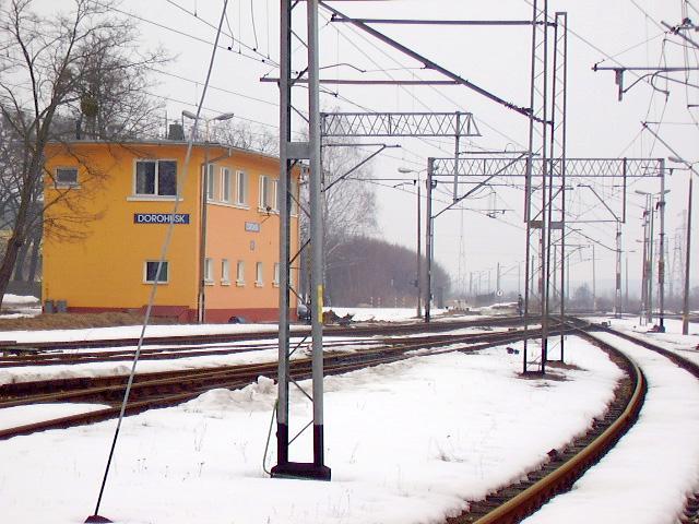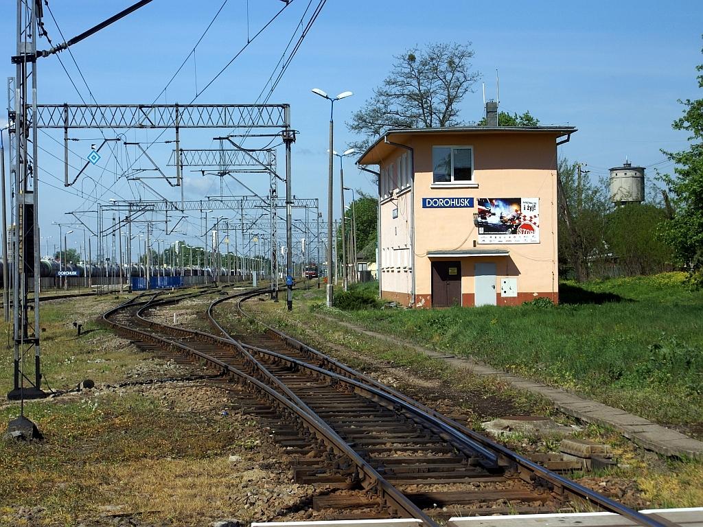 Dorohusk. Nastawnia od strony Jagodzina. Obecnie obsługuje całą stację. Za nią przejazd kolejowy i dwa tory do mostu granicznego na Bugu. Trakcja nad torem normalnym kończy się niedaleko mostu.