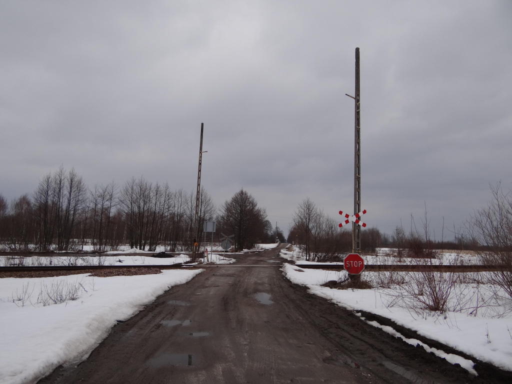 Przejazd drogowy w Okopach-Kolonii. Łącznica szerokotorowa Dorohusk - Damazy. W głębi linie kolejowe Chełm - Kowel. Po lewej poza kadrem terminal przeładunkowy Damazy. W lewo Chełm, w prawo Kowel. 267,8 km/3,7 km.