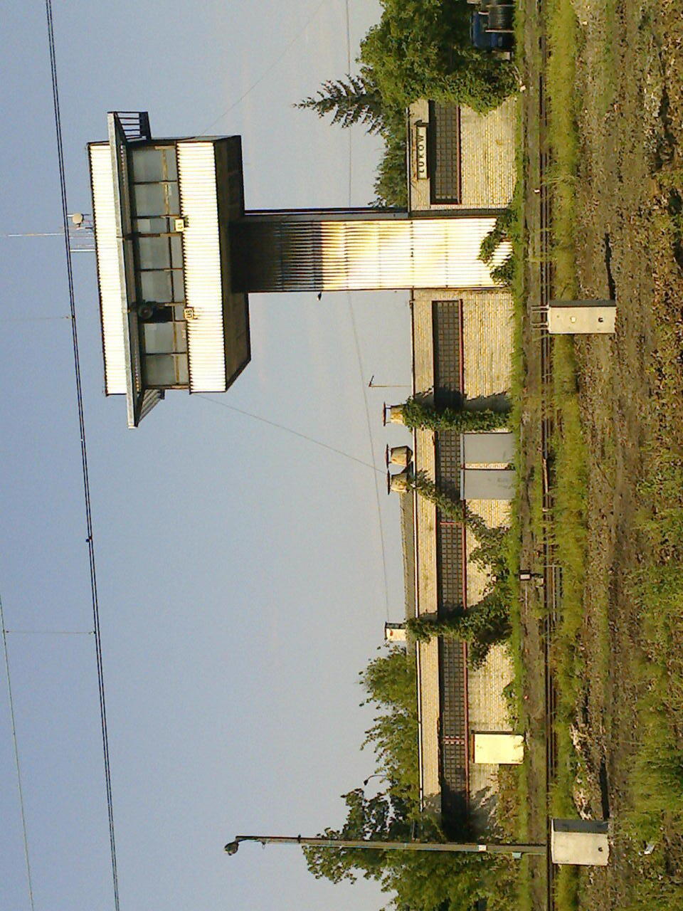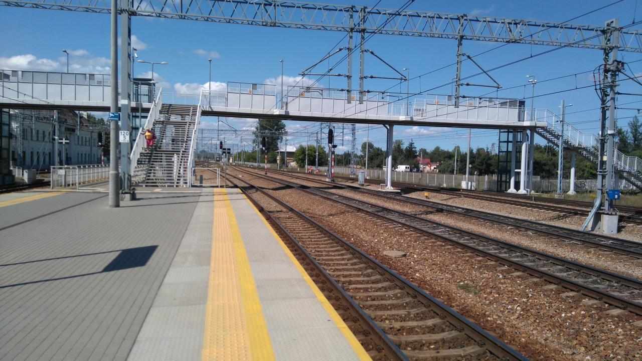 Peron 2 i kładka nad torami. W tle, po lewej dworzec. Widok w kierunku północno-zachodnim: Dęblin, Pilawa, Siedlce/Warszawa.