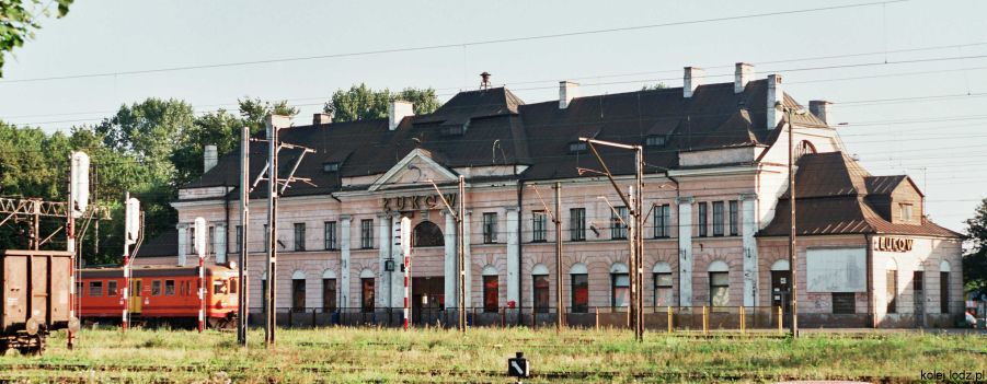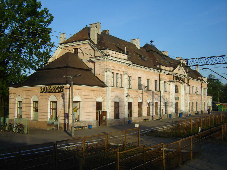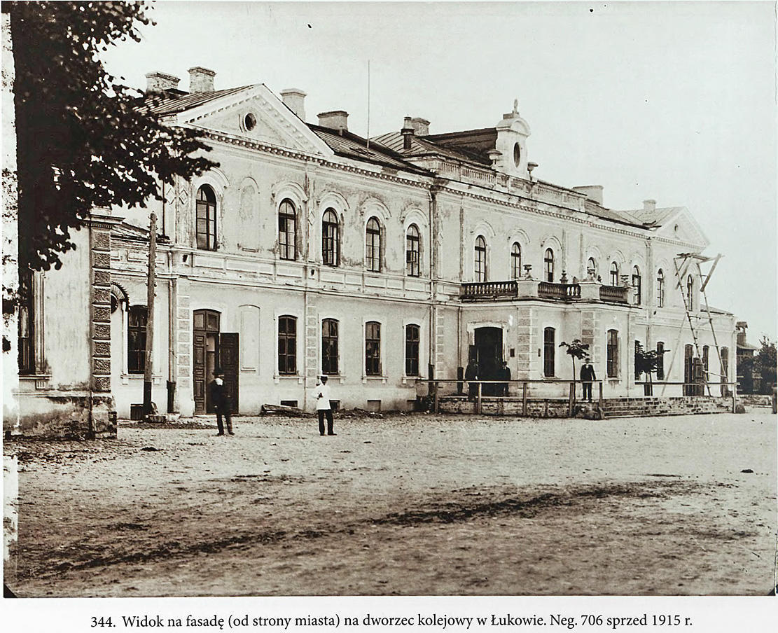 Dworzec PKP w Łukowie od strony miasta przed 1915 rokiem. Widok w kierunku północno-wschodnim; w lewo Dęblin, Siedlce/Warszawa (linii do Pilawy jeszcze wtedy nie zbudowano), w prawo Lublin, Biała Podlaska.