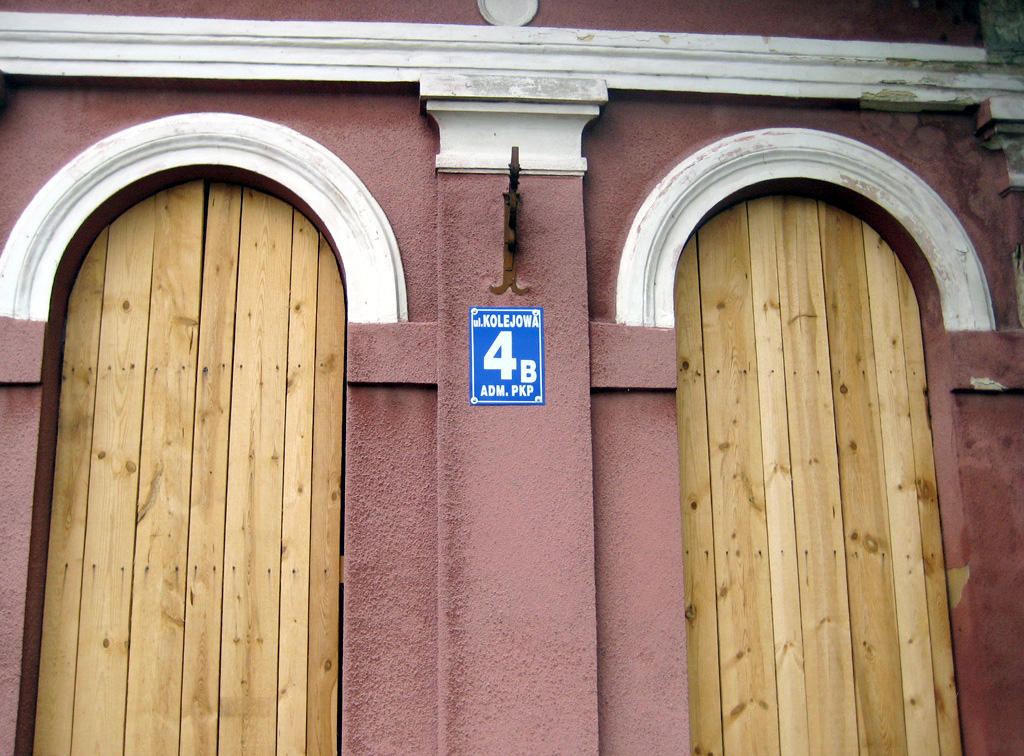 Nieczynna stacja PKP Mordy. Drzwi wejściowe do budynku dworcowego od strony dojazdu.