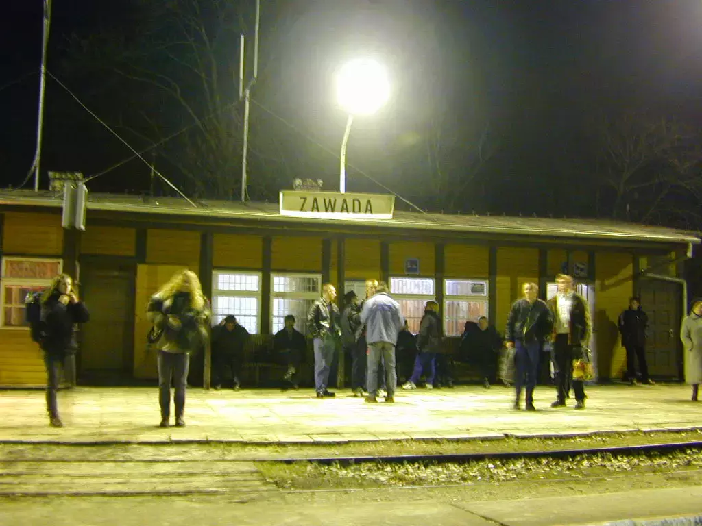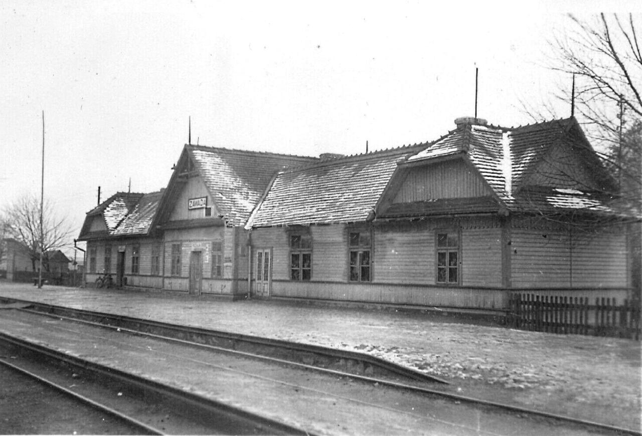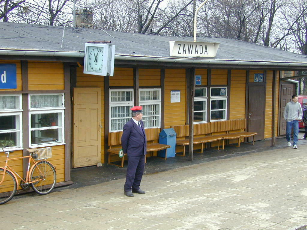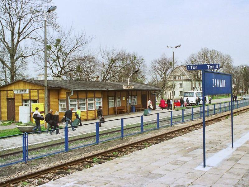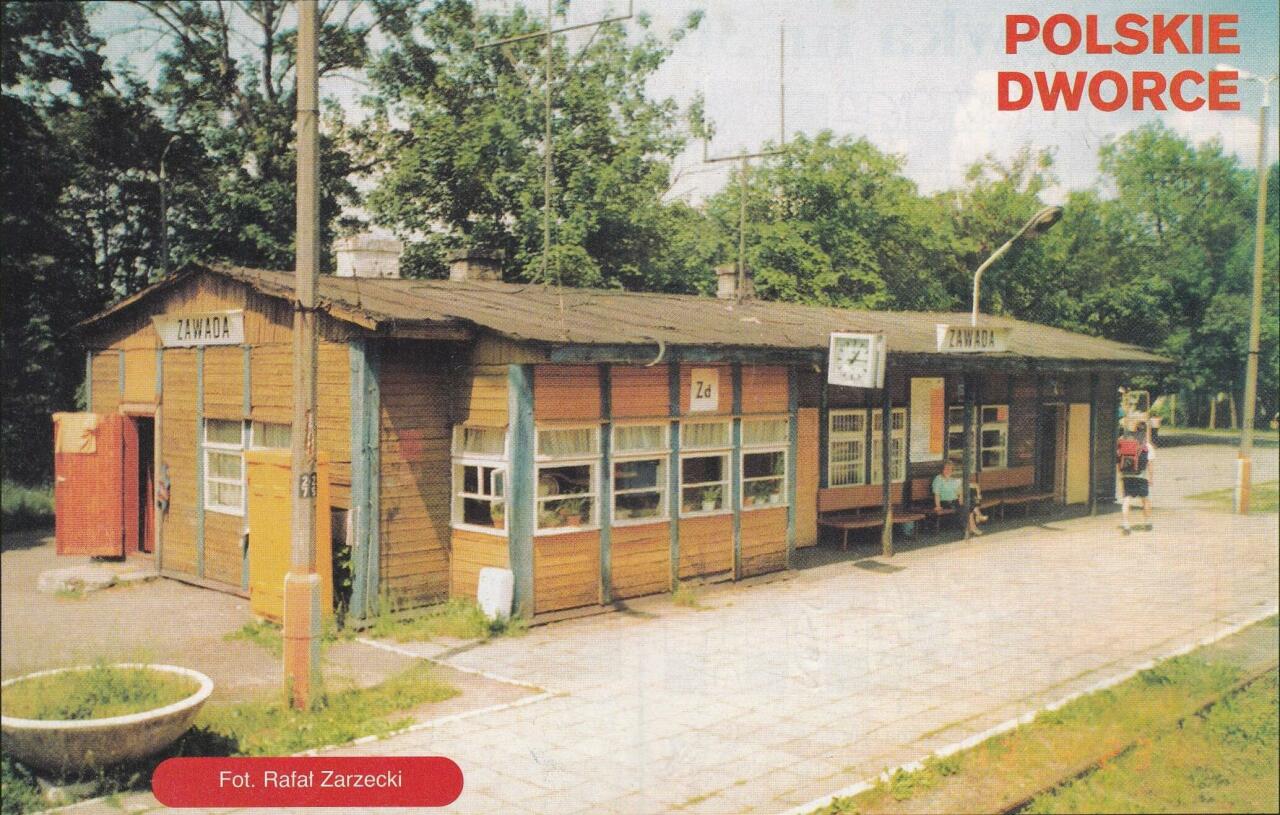 Dworzec (już nieistniejacy) i zupełnie odmienne od dzisiejszych, perony stacji Zawada. Na parterze dworca, po lewej stronie mieściła się nastawnia dysponująca. W momencie wykonania zdjęcia przeniesiona na wschodnią głowicę stacji, w miejscu dawnej nastawni wykonawczej Zd1. Widok w kierunku północno-zachodnim; w lewo Zwierzyniec, w prawo Rejowiec, Zamość.