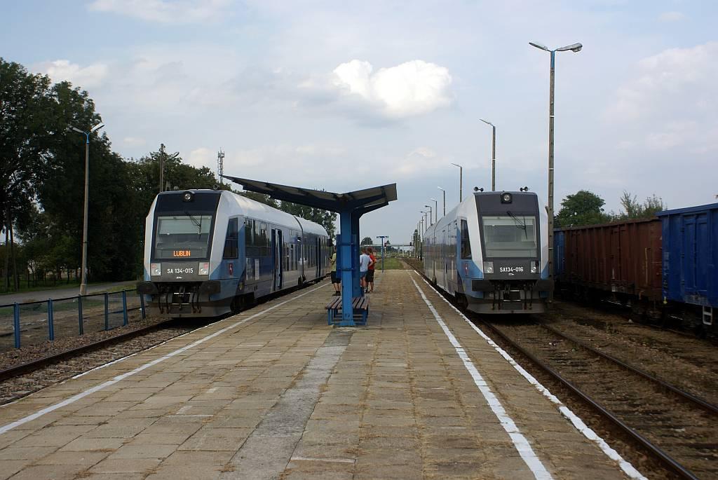 Spotkanie szynobusów. Widok z peronu wyspowego w stronę Rejowca i Zamościa.