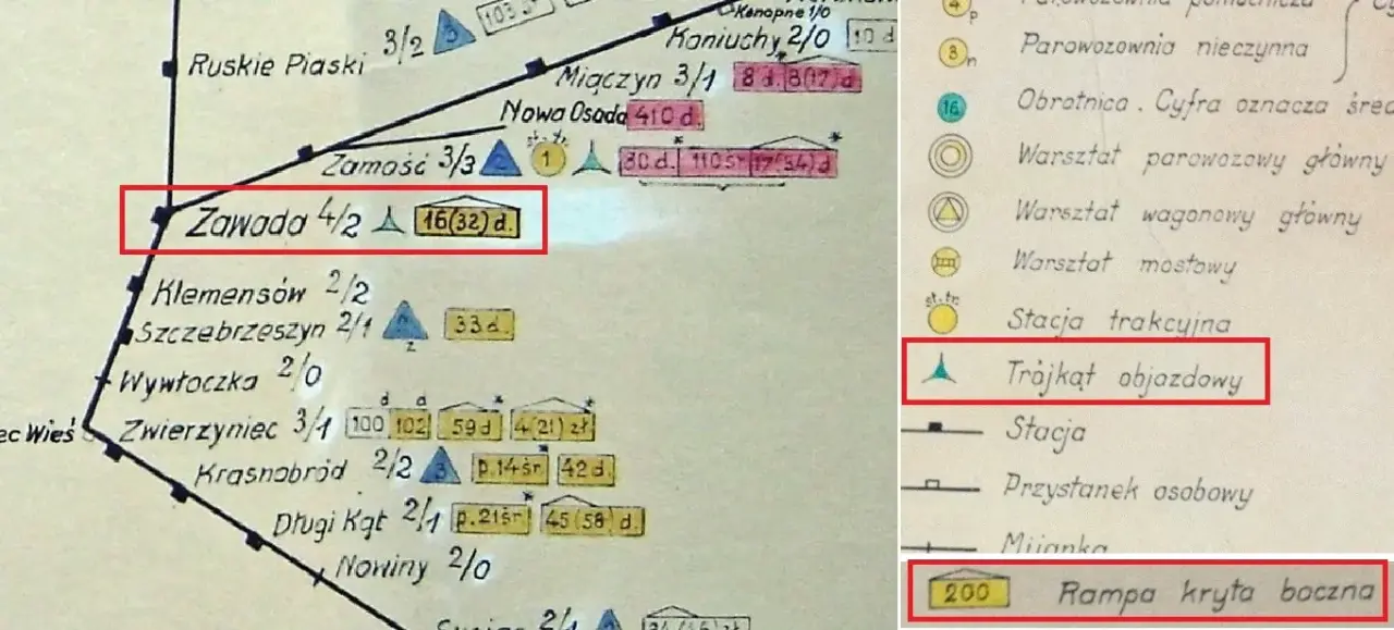 Wg wspomnianej mapy, arkusz D.O.K.P. Radom, stacja Zawada przed II w. św. posiadała cztery tory główne (zasadnicze i dodatkowe) oraz dwa tory boczne, była na niej rampa kryta boczna, o długości użytkowej 16 m. i ogólnej 32 m., konstrukcji drewnianej (kolor żółty), w stanie dobrym (literka d przy symbolu rampy), czyli „zdatna do użytku w każdej chwili w kontekście przewożenia ciężkich pojazdów. Z mapy wynika, że już przez wybuchem wojny w Zawadzie był także trójkąt objazdowy. Jeżeli istnieją dokumenty mówiące o tym, że ułożyli go Niemcy, w czasie wojny, to może było tak, że został on uszkodzony / zniszczony we wrześniu 1939, stąd ułożono go na nowo, lub wymagał np. remontu powiązanego z wymianą nawierzchni, np. jeszcze przed operacją Barbarossa, oraz później w latach 1942-44, w ramach wsparcia dla frontu wschodniego Niemcy rozbudowywali torowiska i infrastrukturę na wielu stacjach, w tym w Prusach Wschodnich i wschodnich terenach okupowanej Polski, gdzie była potrzeba wymieniano też nawierzchnię na cięższą, bardziej nadającą się do wzmożonego ruchu ciężkich pociągów wojskowych, choć opierając się na powojennej inwentaryzacji i paszportyzacji nawierzchni dokonanej przez PKP, w przypadku stacji Zawada prawdopodobnie nie miało to miejsca (dominowały na niej przedwojenne typy szyn, lekkie i średnie).