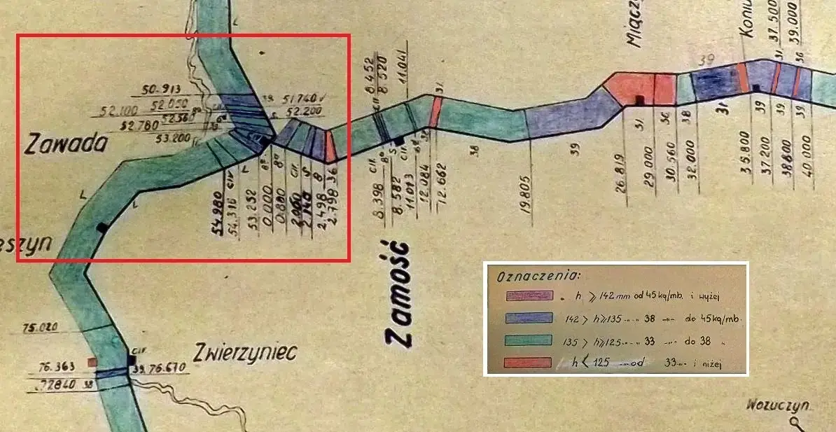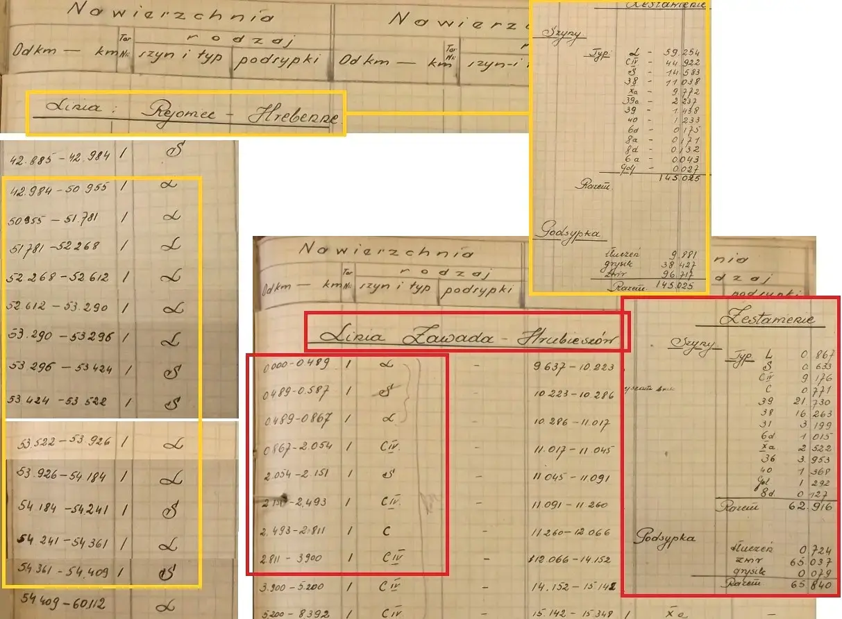 Stacja Zawada i jej okolice – frgm. paszportyzacji typów szyn w torach głównych w obrębie D.O.K.P. Lublin wg stanu na 1.01.1949. Fragmenty stosownych tabeli, gdzie: w ramkach żółtych linia Rejowiec – Hrebenne, w czerwonych linia Zawada – Hrubieszów. Kompilacja dokonana na rzecz fotografii uwzględnia fragmenty tabel z kilometrażem stacji Zawada i jej okolicy, dla obu linii oraz końcowe zestawienie typów szyn dla całej linii, w km. torów głównych).