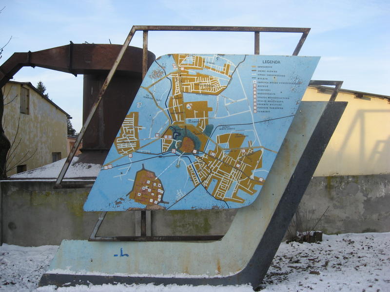 Tablica informacyjna przed dworcem - stan techniczno-estetyczny raczej nie zachęca do odwiedzenia Zamościa.