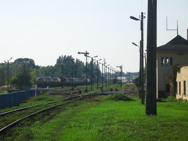 Widok w stronę Hrubieszowa z końca peronu. Z lewej strony magazyny towarowe.