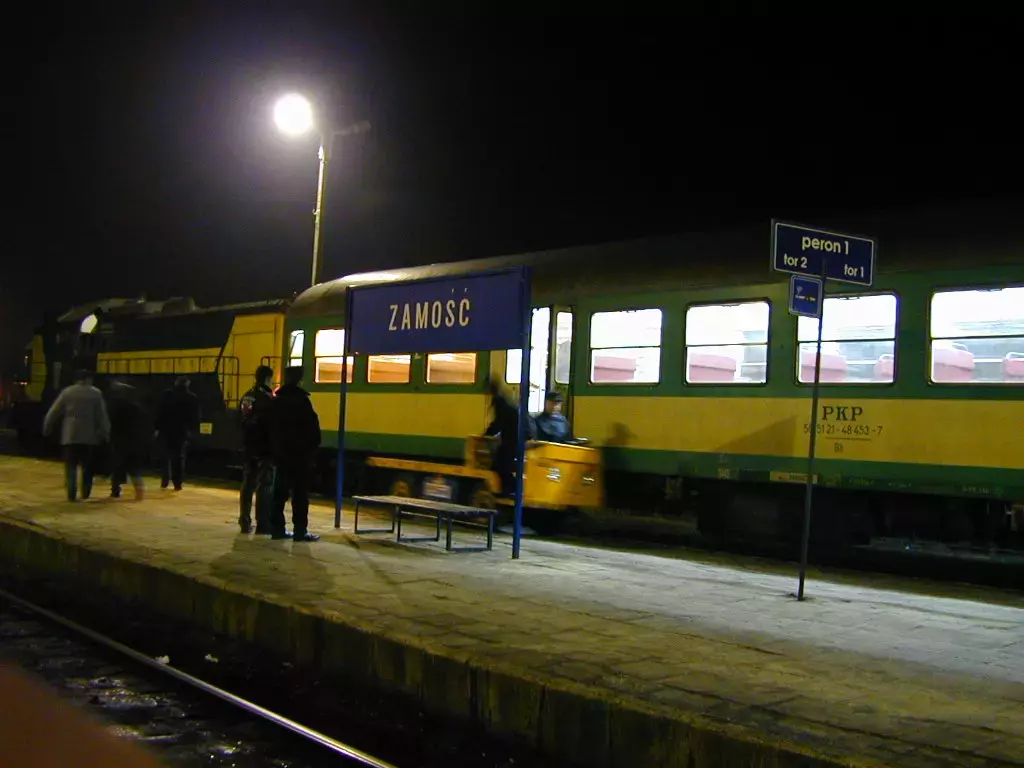 Peron zamojskiego dworca po zmroku. W styczniu to nic dziwnego. Przy peronie 1 oczekuje poc. 22232 relacji Zamość - Zawada, o. 17.51, skomunikowany z pośpiesznym z Rawy Ruskiej do Warszawy Zachodniej. W lewo Zawada, w prawo Hrubieszów.