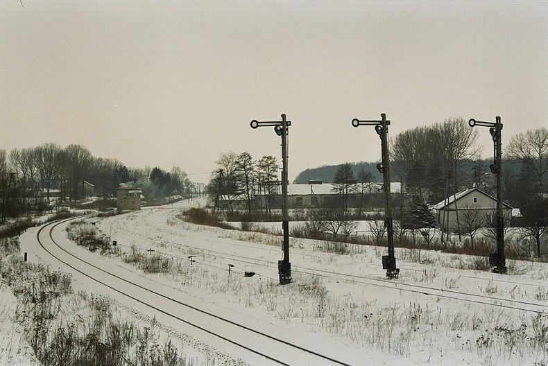 Wschodnia głowice stacji Werbkowice (wjazd od strony Hrubieszowa). Mimo, iż pora roku jest podobna, nie jest to niestety widok współczesny; obecnie zrobienie podobnego zdjęcia jest już niemożliwe. Nie istnieje dawna nastawnia dysponującą, zaplecze taboru Hrubieszowskiej Kolei Dojazdowej, a kształty zostały zamienione na semafory świetlne. Widok w kierunku zachodnim.