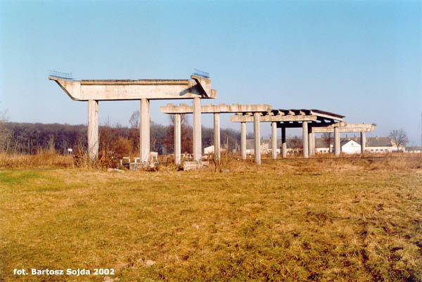 Nieukończona konstrukcja wieloprzęsłowego wiaduktu drogowego nad torami kolejowymi linii Zawada - Hrubieszów Miasto, LHS oraz rzeką Huczwą. Miał on przenieść ruch z widocznego na pierwszym planie przejazdu kolejowego. Inwestycję planowano w związku z budową największej w Europie cukrowni w Tyszowcach, co spaliło na panewce. Przeprawa padła ofiarą zatrzymania inwestycji w schyłkowym okresie PRL-u i do dziś pełni rolę pomnika niegospodarności i marnotrawstwa. Widok w kierunku północnym. W lewo kierunek Zawada, w prawo perony i Hrubieszów. Zdjęcie dzięki uprzejmości Bartosza Sojdy.