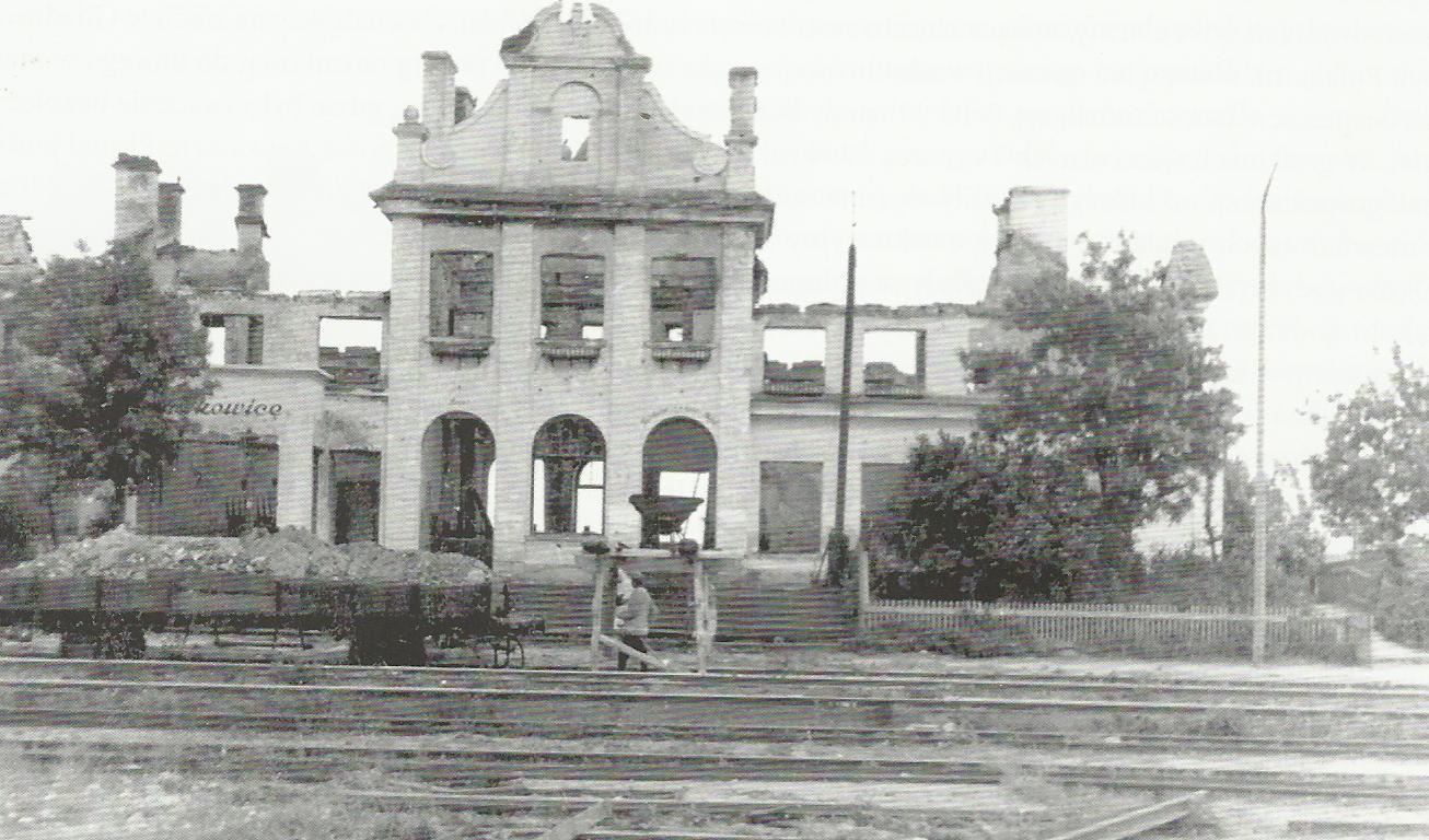 Zniszczony przez działania wojenne budynek dworca kolejowego w Werbkowicach. Widok w kierunku południowym; w lewo peron i Hrubieszów, w prawo Zamość.