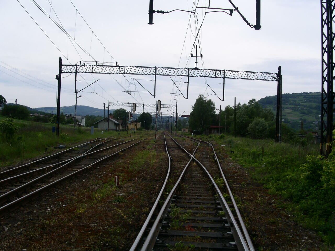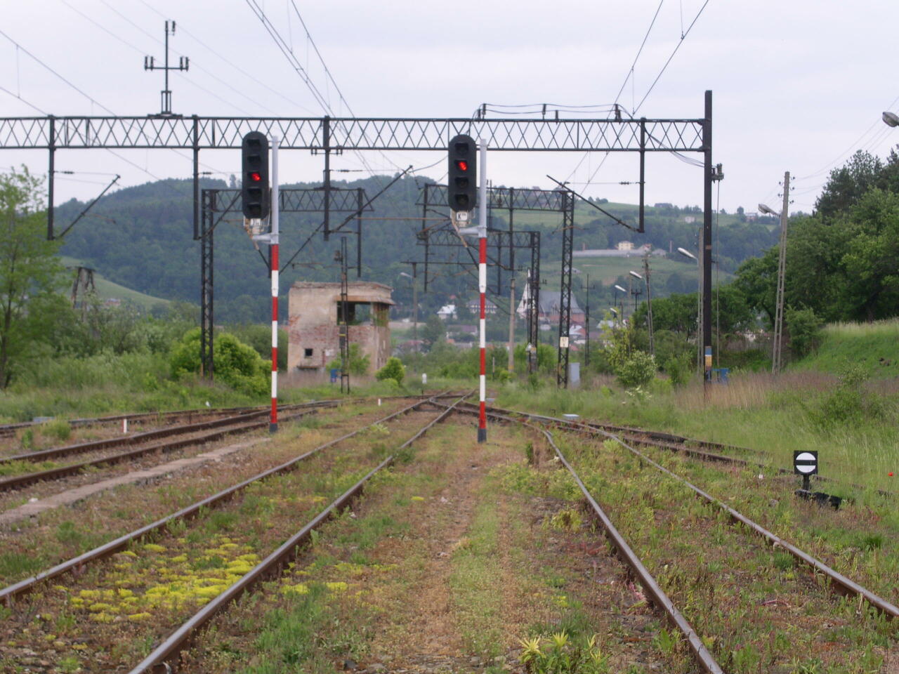 Wjazd na stację od strony Nowego Sącza. Widoczny zrujnowany budynek nastawni oraz prosta wstawka w łuku powstała najprawdopodobniej podczas elektryfikacji i przebudowy stacji.