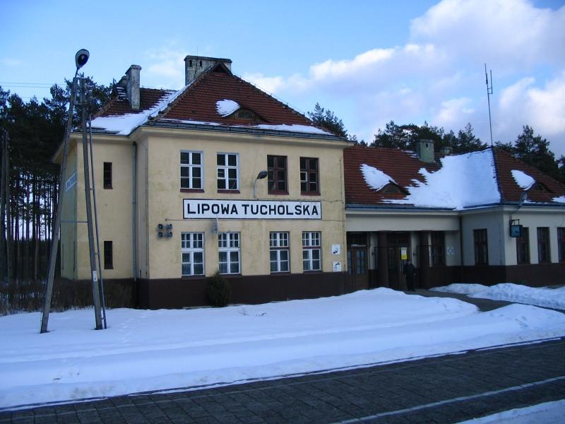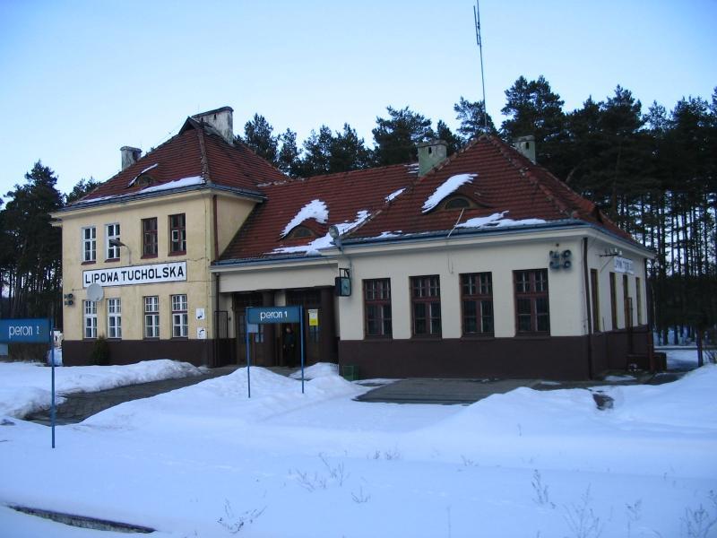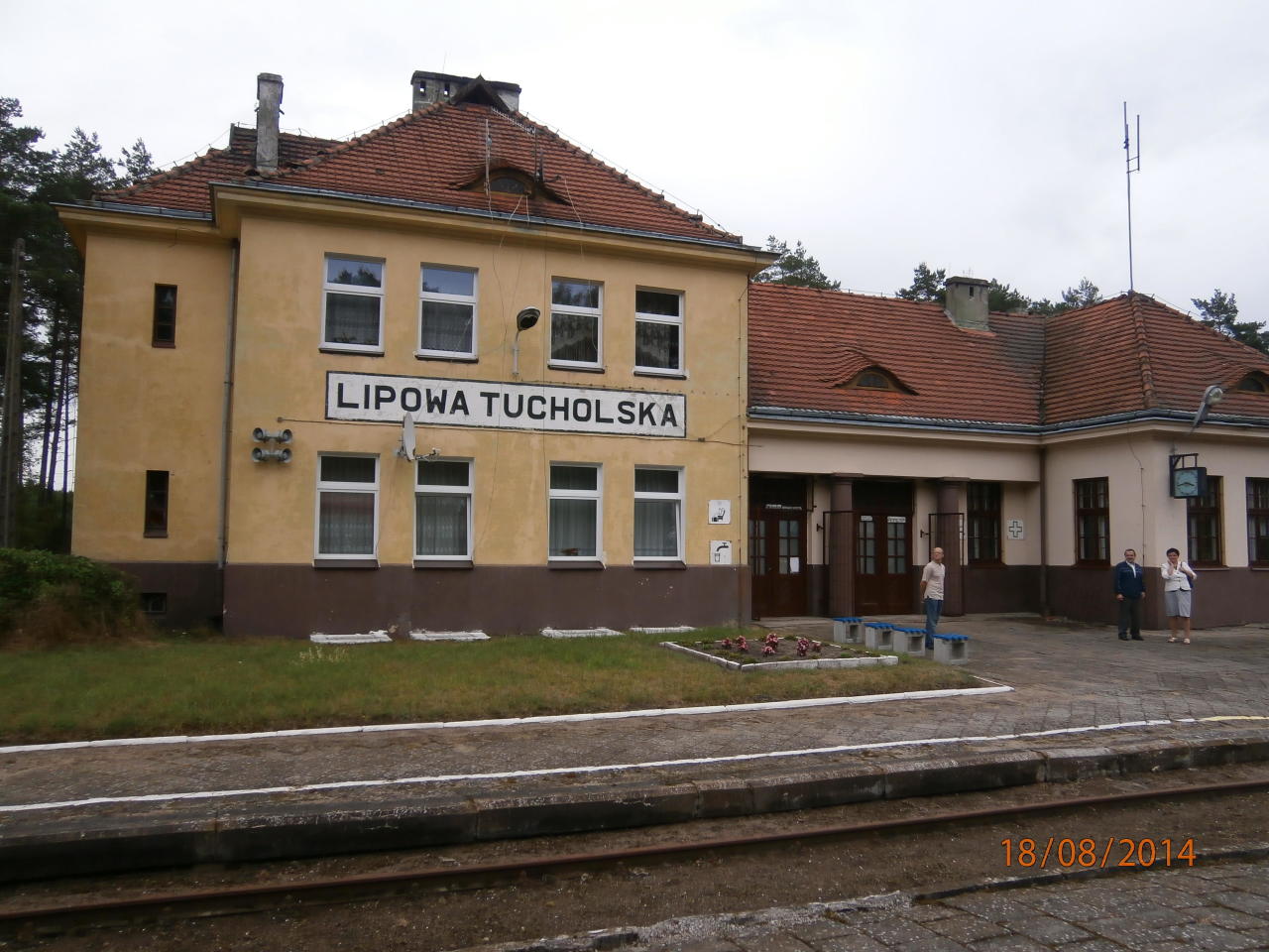 PKP Lipowa Tucholska. Budynek jakże przepięknej stacji kolejowej, widziany od strony tego dnia najbardziej uczęszczanej, czyli po prostu od peronów i wjazdu z Wierzchucina.