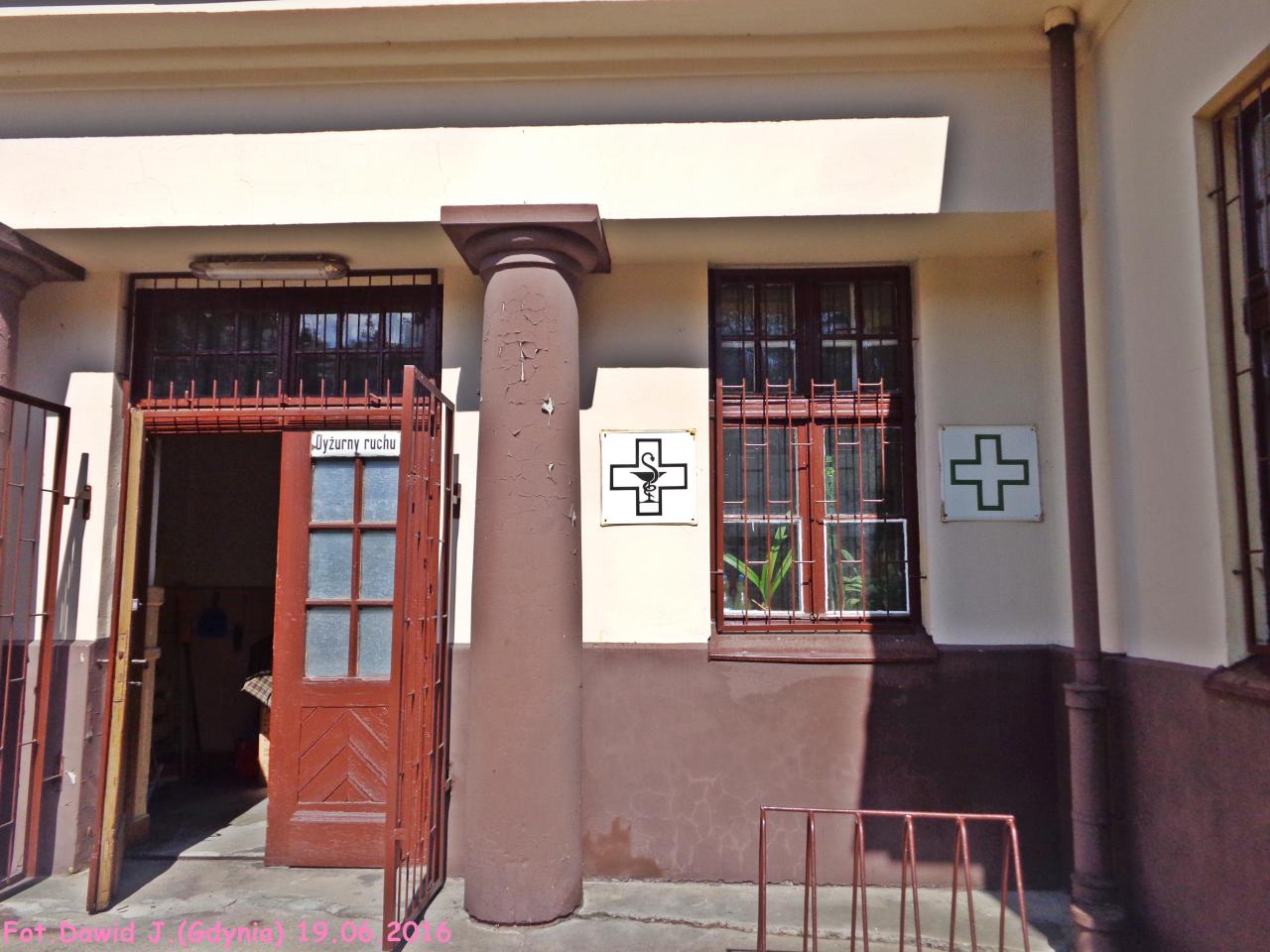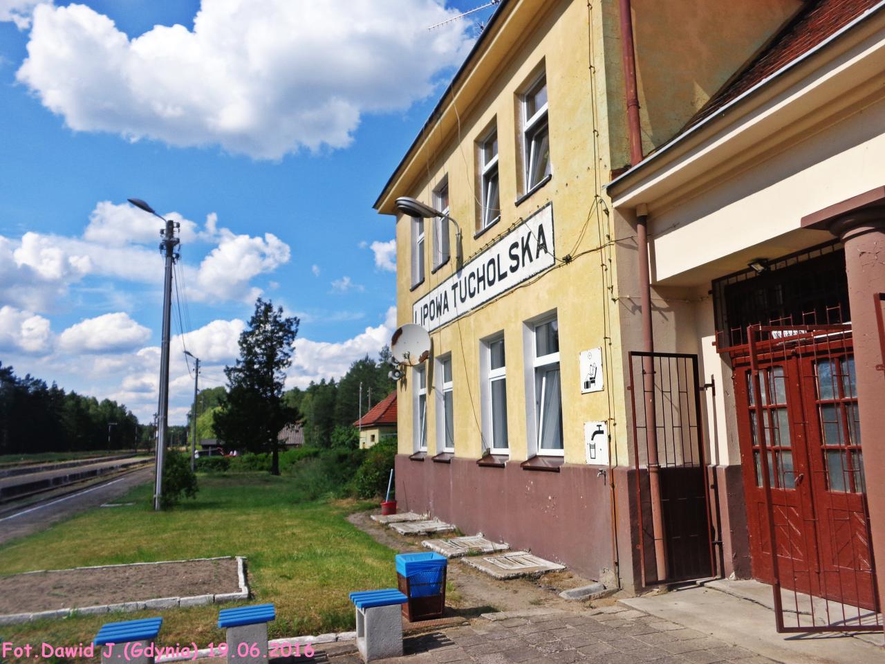 Budynek dworcowy widoczny od strony torów. Wejście do pomieszczenia nastawni "LT". W lewo Bąk/Gdynia Główna i Szlachta; w prawo Wierzchucin/Bydgoszcz Główna.