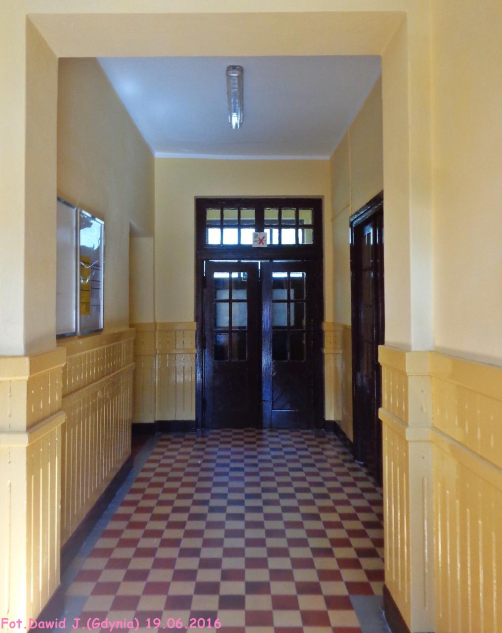 Wnętrze budynku dworcowego. Wyjście do miejscowości. Po prawej stronie znajduje się poczekalnia dla podróżnych z nieczynnym okienkiem kasy biletowej.