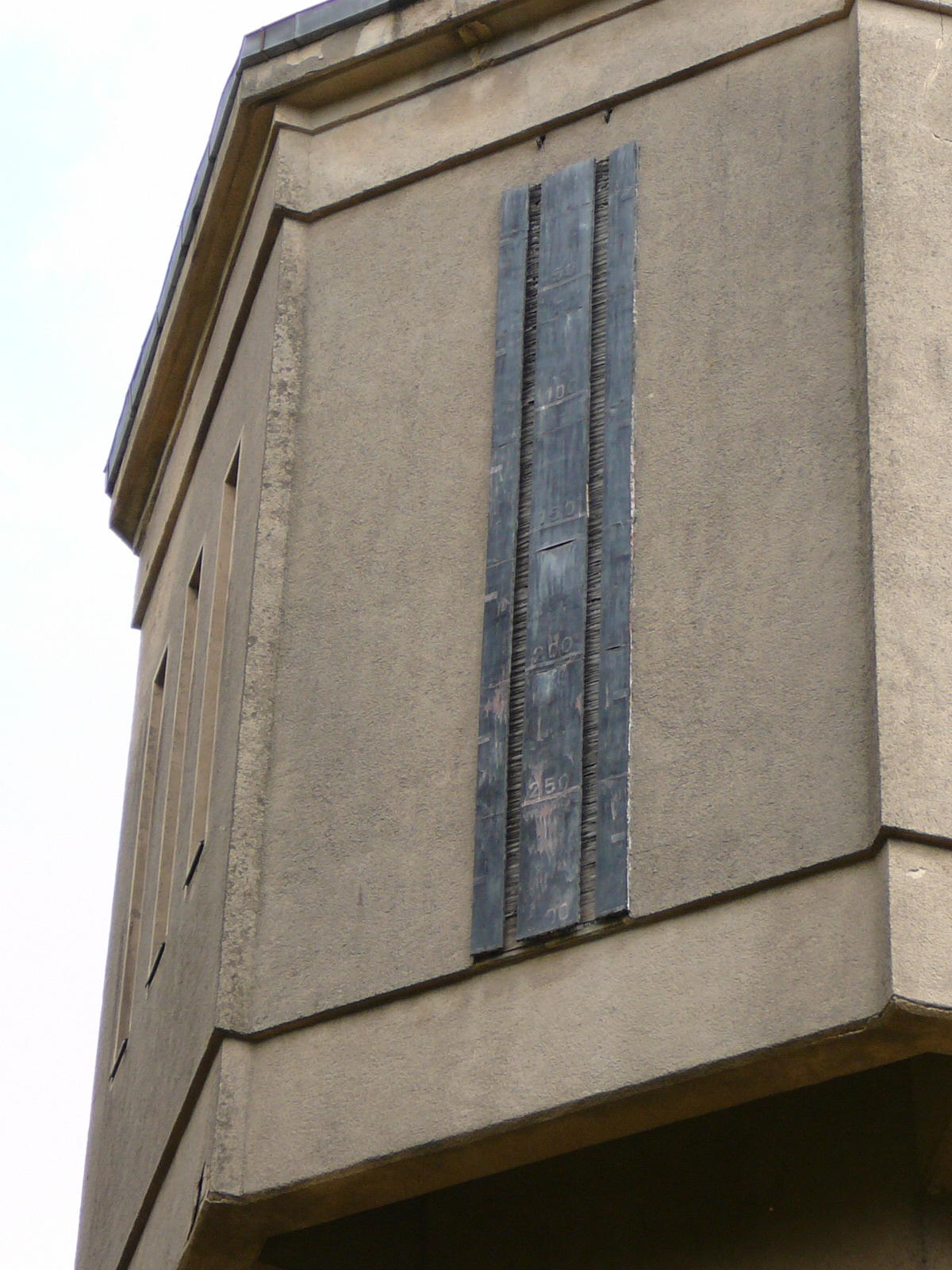 Lipowa Tucholska. Wieża wodna, wskaźniki poziomu wody w zbiornikach umieszczone na zewnątrz górnej części wieży (cz. zbiornikowej), od strony lasu.